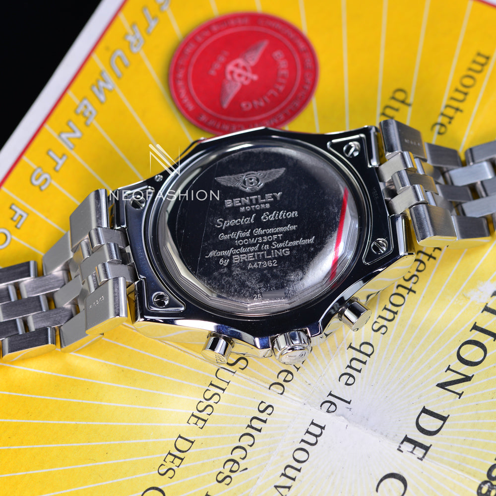 One of the key features of the Breitling for Bentley GMT A47362 is its GMT function, allowing the wearer to keep track of two different time zones simultaneously. The GMT hand is red, adding a pop of color to the overall design of the watch, and can be adjusted easily using the crown. Additionally, the watch features a date display at the 6 o'clock position.