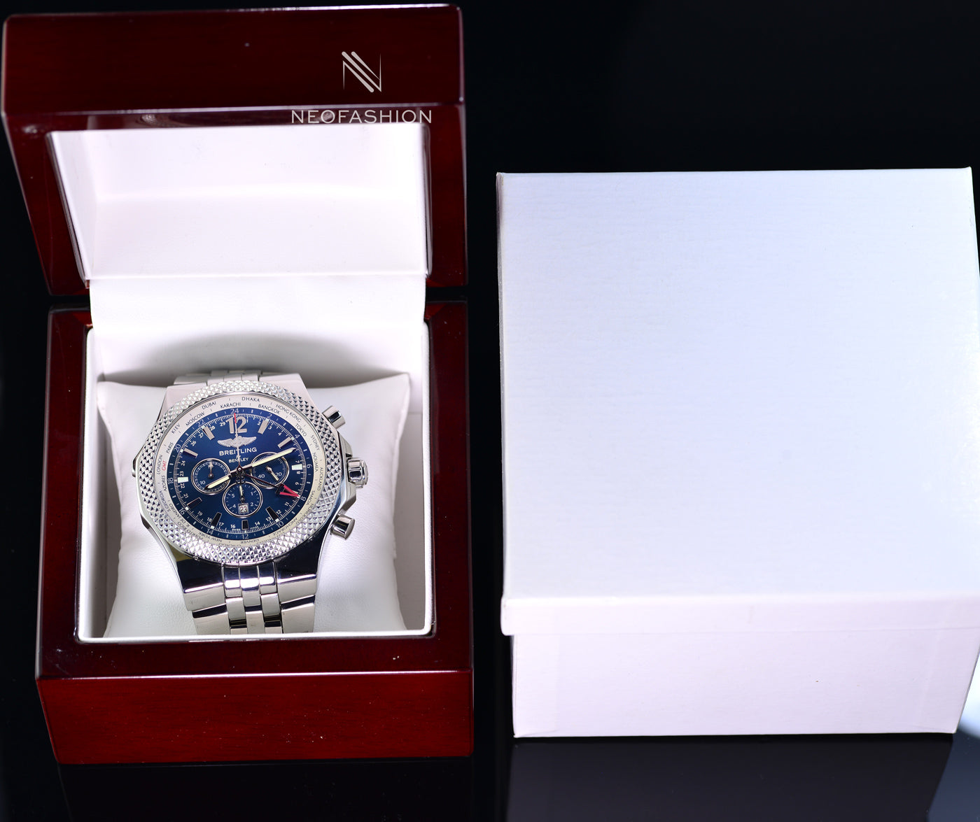 The Breitling for Bentley GMT A47362 is a luxurious and stylish timepiece that combines the expertise of two iconic brands, Breitling and Bentley. The watch features a 49mm stainless steel case with a striking blue dial and three blue sub-dials, adding to its sporty and elegant appeal. The large, polished steel hour markers and hands are coated with luminescent material, making it easy to read the time even in low light conditions.