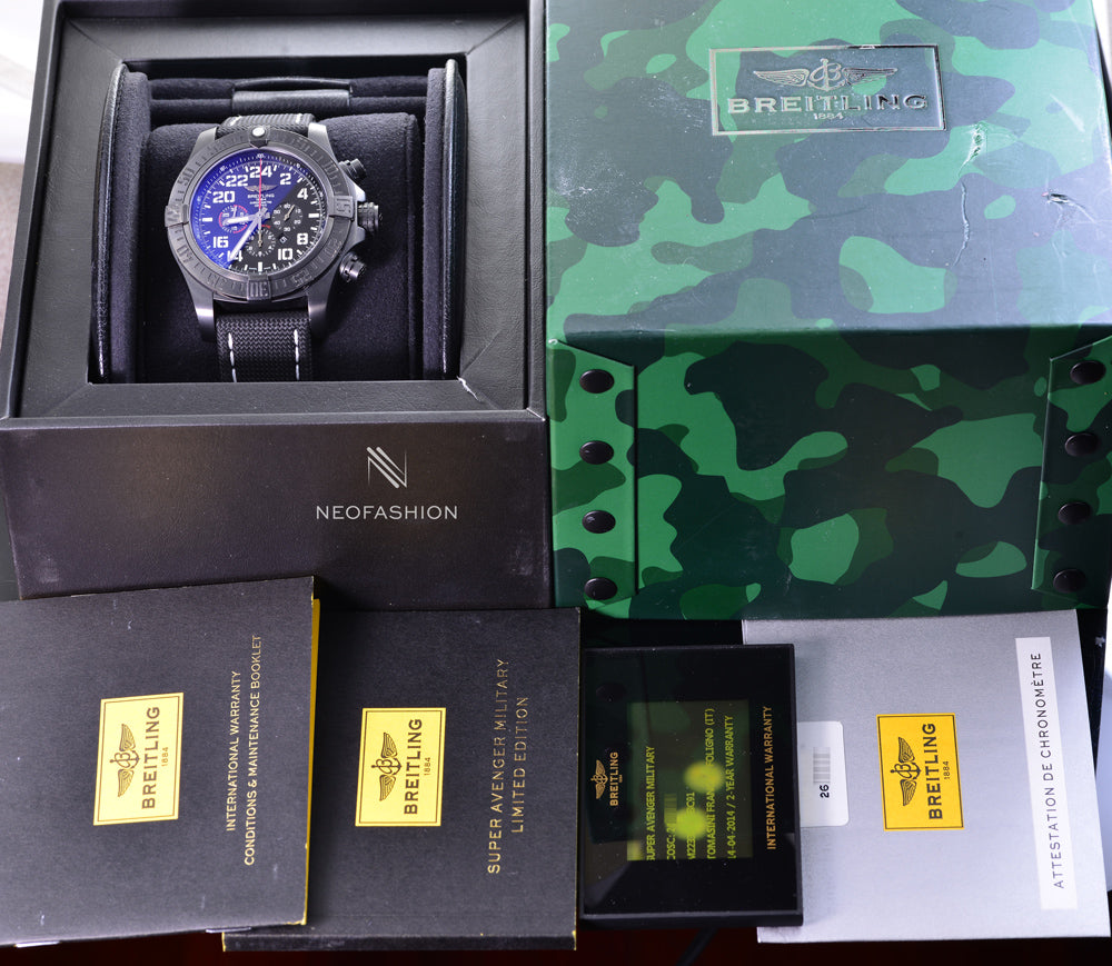 The Breitling Military Super Avenger II M22330 is a bold and highly distinctive version of Breitling’s legendary aviation chronograph, built for extreme durability and maximum legibility. Designed with military inspiration, this model features a striking 24-hour dial and a stealthy black steel case, giving the watch a powerful tactical presence while maintaining the precision and craftsmanship the brand is known for.